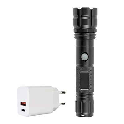 PNI Adventure F10 Aluminum Flashlight Pack with LED 6W 500lm up to 200m Focus CHG300 Battery Power Supply USB C Port, QC3.0, PD3.0, PPS and A Port 30W