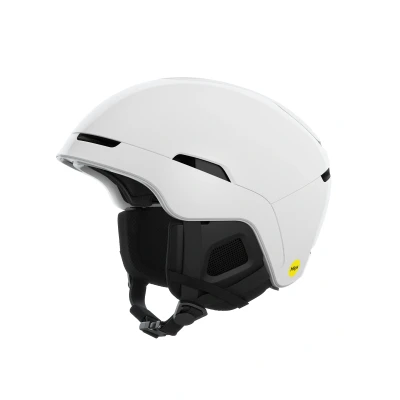 POC Obex MIPS ski helmet. A well considered helmet that combines proven impact protection with practical features for all-mountain use. The helmet employs MIPS, a low-friction layer designed to reduce rotational forces to the brain in angled impacts. Hybrid construction pairs a tough ABS outer shell with an EPS liner for controlled energy absorption. The result is a helmet that meets contemporary safety expectations while remaining relatively lightweight, weighing about 500 g depending on size. Fit and comfort are addressed through POC's Wheel Fit system and a 3D fit liner. The rear adjustment dial allows quick, precise tuning even when wearing gloves. Adjustable ventilation helps regulate temperature on variable days, and detachable earpads provide flexibility for personalised comfort and easier care. Integration with goggles is straightforward thanks to a secure goggle fastening at the back, which keeps the strap in place during active use. The Obex MIPS is a sensible choice for skiers who want a reliable, well featured helmet with clear attention to fit, ventilation and impact protection.
