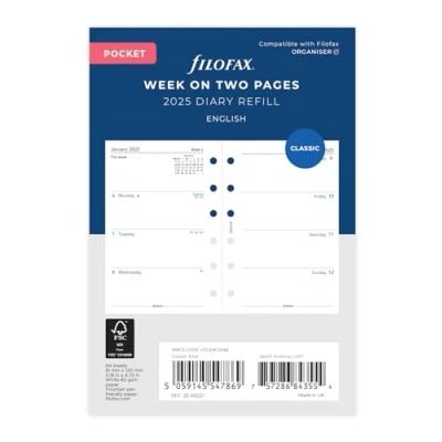 Filofax Pocket 2025 diary refill Week on two pages format 5 languages - English, French, German, Dutch and Italian White paper Paper size 81mm x 120mm