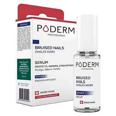 ✅ ATHLETE/ACTIVE NAILS SPECIAL ●● The PODERM FORTIFIANT - BLACK AND INJURED NAILS serum repairs and protects nails injured by repeated micro-shocks in closed-toe shoes, football boots, rugby boots, hiking boots, skiing boots, running shoes, etc. This product helps the re-absorption of haematoma and prevents fungal infections in damaged nails. ✅ PROFESSIONAL TREATMENT ●● The PODERM FORTIFIANT - BLACK AND INJURED NAILS has been developed by a Swiss podiatrist to treat and protect the nails of athletes and active individuals. Clinically proven treatment: 95% of users found the product to be effective, 73% said that the results were quickly visible, and 100% of users were satisfied with the product. ✅ NATURAL FORMULA / SWISS MADE ●● PODERM develops innovative formulas, using the therapeutic properties of plants which are grown using chemical-free processes and then distilled to extract 100% pure and natural essential oils. The product manufacturing process is completed entirely in Switzerland, including quality control protocols which comply with the most demanding standards. ✅ QUICK AND EASY TO USE ●● The bottle comes with an integrated applicator brush. For optimal efficacy, apply the product onto the nail, the nail edges, cuticles, the nail bed and grooves. Apply the oil-serum daily, AM and PM, then leave to soak in. ✅ CAN BE USED WITH PODERM COLOR CARE NAIL VARNISH. ●● PODERM nail varnish is enriched with Tea Tree, Biotin and Silicon. Available in 6 long-lasting colours, boasting purifying, nourishing, and breathable qualities. They keep nails in good health and allow PODERM Oil-Serums pass through in order to continue treating any damaged nails. A SPECIAL MEN'S nail varnish is available to camouflage the nail (MATTE beige).