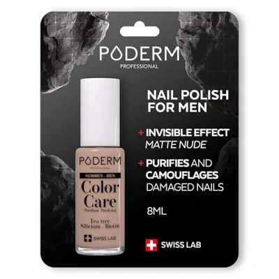 ✅ SPECIALLY FOR MEN, CAMOUFLAGES THE IMPERFECTIONS IN NAILS THAT ARE YELLOW & DAMAGED FROM FUNGAL NAIL INFECTIONS. ●● This concealing varnish is invisible, skin-color & matt, perfect for men! This product will allow you to show your feet and hands without embarrassment! Color Care is suitable for all nails on feet and hands, for men as well as for diabetics and children. ✅ PREVENTS AND TREATS THE APPERARANCE OF FUNGAL NAIL INFECTIONS, YELLOW AND DAMAGED NAILS ●● Color Care nail varnish is unique on the market: no need for a base coat, one application is sufficient to camouflage the nail while eradicating the parasitic fungus that causes yellow and damaged nails. ✅ ENRICHED WITH TEA TREE, SILICIUM AND BIOTIN / SWISS MADE ●● PODERM develops innovative formulas, using the therapeutic properties of plants which are grown using chemical-free processes and then distilled to extract 100% pure essential oils. The product manufacturing process is completed entirely in Switzerland, including quality control protocols which comply with the most demanding standards. ✅ BREATHABLE, COMPLEMENTS PODERM OILS-SERUM ●● This nail varnish guarantees that nails are kept healthy and allows the PODERM Oils-Serum to pass through, in order to continue treating one or more damaged nails. ✅ LONG-LASTING VARNISH ●● Its precise brush moulds perfectly to the shape of the nail, adapting to its width and allowing a concealing, uniform and line-free application for a natural result.