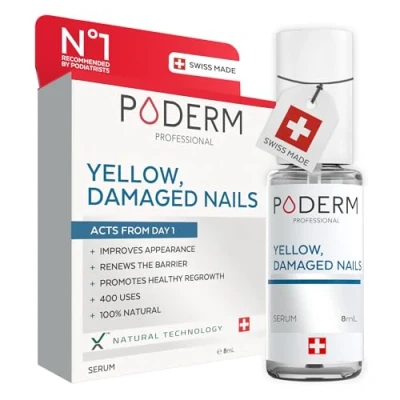 ✅ IMPROVES THE APPEARANCE OF THE NAIL ●● PODERM's Yellow & Damaged Nails Serum clarifies, repairs, and smooths the nail, specifically targeting the visual appearance of yellow, stained, and damaged nails. The serum starts to work from the first day: it renews the nail's barrier and ensures healthy nail growth. Visible results quickly appear on both hand and foot nails. ✅ PROFESSIONAL TREATMENT ●● The Yellow & Damaged Nails Serum by PODERM was developed by a Swiss podiatrist. Get clearer, smoother, and shinier nails in just 4 weeks with 100% satisfaction. Furthermore, 100% of our users find their nails clearer and shinier within 4 weeks. The Yellow & Damaged Nails Serum starts acting from the first day, and 95% of our users see visible results in record time. Don't wait any longer to have the nails you deserve. ✅ NATURAL FORMULATION / SWISS MADE ●● PODERM develops innovative formulations using the purifying properties of plants grown without chemicals and distilled to obtain 100% pure and natural essential and vegetable oils. The product manufacturing in Switzerland includes quality controls that meet the most demanding standards. ✅ SIMPLE AND FAST APPLICATION ●● The bottle comes with an applicator brush. For optimal effectiveness, apply the product to the nail and the healthy skin around the nail (cuticles, nail bed, and grooves). Apply the serum daily, morning and evening. In case of a nail fungus diagnosed by a healthcare professional, PODERM's Nail Fungus Serum is specifically designed to eliminate the responsible fungus. ✅ COMPATIBLE WITH PODERM NAIL FUNGUS SERUM ●● The PURIFYING SERUM - NAIL FUNGUS PODERM effectively fights nail fungus, yellow & damaged nails, and nail psoriasis. It acts mechanically and forms a protective lipid film that eliminates fungal infection and treats the nail thoroughly. Recommended by podiatrists and dermatologists, suitable for adults, children over 3 years old, pregnant women, and diabetics. Medical device.