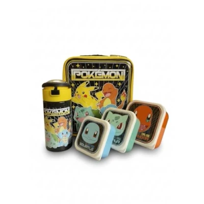 Pokemon 5 Piece Lunch Set Kids Bag, 450ml Lockable Water Bottle 3 Nesting Snack Boxes Different Sizes Featuring Chamander, Bulbasaur & Squirtle School Kit for
