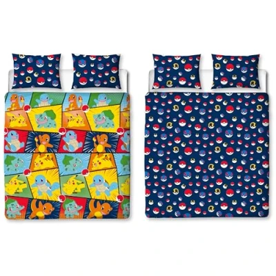 OFFICIAL PRODUCT: Officially licensed Pokemon bedding set, includes a double duvet cover and pillowcase, and features multiple Pokemon characters including Pikachu and Charmander REVERSIBLE: Freshen up the look of your child’s bedroom with 2 designs in one. On the front side there’s a comic book style pattern of Pikachu, Charmander, Squirtle and Bulbasaur. On the reverse side there’s a repeating pattern of Pokeballs and Ultra Balls on a blue background, with a matching reversible pillowcase EASY CARE: The double duvet cover is closed with poppers, so it’s easy to open and remove ready for the wash! The bedding is washing machine and tumble dryer safe at a low temperature SOFT & COMFY: Made from brushed microfibre, this bedding set is soft to the touch, and comfortable throughout the night MEASUREMENTS: Standard UK double bedding size, the duvet cover measures 200 x 200cm, and the 2 x pillowcases measures 74 x 48cm