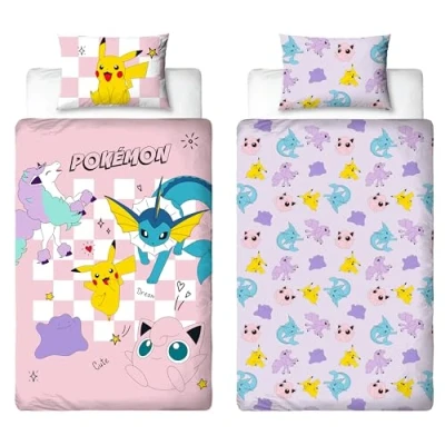 OFFICIAL PRODUCT: Officially licensed Pokemon bedding set, includes a duvet cover and pillowcase, and features a Pikachu, Jigglypuff, Ditto, and Ponyta on a pink background with a gingham pattern REVERSIBLE: With 2 designs in one, on the reverse side there’s a repeating pattern of Pikachu, Jigglypuff, Vaporeon, and Ditto on a lilac background, that runs on to one side of the pillowcase EASY CARE: The duvet cover is closed with poppers, so it’s easy to open and remove ready for the wash! The bedding is washing machine and tumble dryer safe at a low temperature RESPONSIBLY MADE: Made using recycled and responsibly sourced materials, this Pokemon bedding set is made from a polycotton mix (52% cotton 48% polyester) MEASUREMENTS: Standard UK single bedding size, the Pokemon duvet cover measures 135 x 200cm, and the pillowcase measures 74 x 48cm