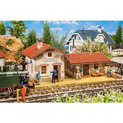 Gauge G, scale: 1/22.5, item group: railway stations Jewellery Rural railway station ensemble consisting of utility building and waiting room with red brick roofs, stone plaster facade, movable doors and rung windows. Numerous details, such as an elaborate advertisement sheet, benches and decorative windboards make the breakpoint a popular destination and departure place. The enclosed building base plates serve as a platform platform. We recommend our adhesive 170490/170492 as well as Vallejo colours. Dimensions: 520 x 365 x 280 mm, Manufacturer: Pola