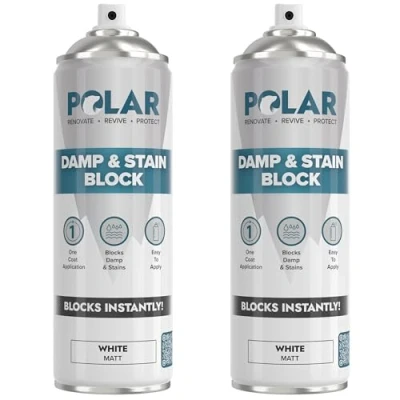 Polar Damp & Stain Block Spray Matt White Paint 2 x 500ml One Coat Anti Mould Proof for Internal Walls, Wood, Stone Brick Blocker Ceiling