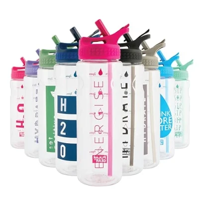 Encourage Yourself To Drink More Water: This Polar Gear water bottle is great at helping to keep you hydrated. Our Drinking bottle features motivational messages that serve as a reminder to stay on track for drinking with handy hourly markers down the side of the bottle. Our water bottles with straw will help you to stay healthy and quench your thirst. Each design is different, so grab one for all the family to keep cool this year! A Smart Bottle You'll Never Lose: It’s only too easy to leave your reusable water bottle somewhere when you're busy. Use the integrated carry hoop to hook onto your bag and never lose your drinks bottle with straw again. Our flip-up straw opens with one finger, so it's easy to sip when working out or driving. You don't have to tip your head back when sipping due to the smart air valve, so this straw bottle is great for keeping safe and not losing focus. Flip the straw to close the secure silicone seal lid and prevent spillage. Uber Functional: Super lightweight with a detachable internal straw, you can pop in the drink of your choice and away you go. The clear water bottle fits into most standard bike and car drink holders. Safer and less breakable than glass bottles, this 750ml capacity gym water bottle is made of SK Ecozen plastic and is perfect for reaching your daily hydration goals whether you are going to the gym, doing yoga, travelling or even relaxing in the hot tub. Dishwasher Safe: Our drinks bottles for adults are made from SK Ecozen which is as strong as Polycarbonate, stronger than Titan and dishwasher safe. SK Ecozen is an Eco recycled plastic which has excellent transparency and is virtually unbreakable. Our highest quality drinking bottle with straw which is sure to last a very long time! Hydrate With Your Favourite Drink: The extra-wide neck and screw top makes for easy filling, cleaning and emptying of your gym bottle; whether you add ice cubes, water, or even fruit, this water tracker bottle has the capacity for it all. Great gift idea for keeping your loved ones cool and hydrated, and with no plastic taste, the bpa free water bottle makes sure whatever drink you have tastes fresh. Eco-friendly & Reusable: Save the equivalent of 1460 plastic water bottles from getting tossed into a landfill by coaching the next generation into using a reusable non leak water bottle. Helping the planet has never been so easy… or so sleek with our refillable water bottles!