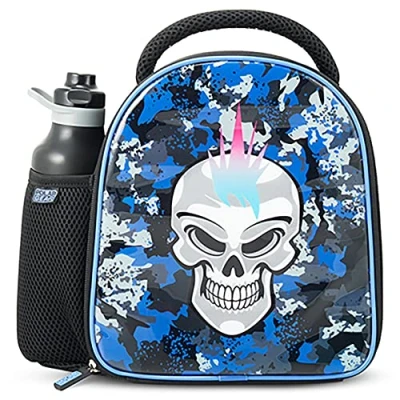 Polar Gear Camo Skull Lunch Bag & Bottle Combo: Our insulated lunch bag has a food-safe PEVA lining and is fully insulated to keep your food fresh with a bottle included in pocket on the side of the bag. Perfect for kids on the go. Designed For Little Hands: Our Camo Skull food cooler has a simple zip closure and wide compartment so your child can access their food without difficulty, and the wide handle at the top of the bag makes carrying easy. Compact Size That Fits A Healthy Kids Lunch: The lunch bag measures 25cm long, 10cm wide and 25cm tall and the 600ml bottle is secure in the side pocket - ample room for adding all your kids favourites making this cool bag great for everyday use for school, sports, after school clubs, days out and holidays. Fold Inside Out For A Spotless Clean: Our lunch bags are super easy to clean. Simply curl the inside of the PEVA lining outwards by the seams to shake off crumbs and wipe down with a clean damp cloth to sanitise for next use. Write Your Child's Name on Their Lunch Bag : On the bottom of the bag is a clear plastic window with a paper insert you can write your child’s name on, so it is easy to see who the bag belongs to. Care & Safety Instructions: Wipe clean with damp cloth. Do not immerse in water. Not suitable for children under 36 months as small parts may present a choking hazard., Weight: 0.36817197754 pounds, Manufacturer: DNC UK Ltd