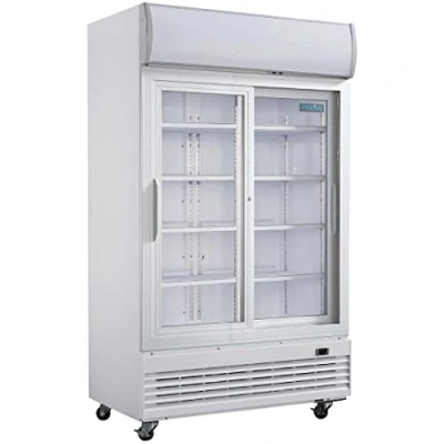 DOUBLE DOOR DISPLAY CHILLER: 950Ltr Polar G-Series Upright Display Cooler with Light Box & Sliding Doors – perfect for convenience stores & food retailers EFFICIENT ENERGY USE: 500W, white finish. Features a self-closing sliding door to reduce running costs ADJUSTABLE SHELVES: Supplied with 5 adjustable shelves per door (10 in total) – providing flexible storage for larger items TEMPERATURE CONTROL: Precise temperature control to ensure optimum food storage temperature (6°C) LED INTERIOR LIGHTING: Attractive interior & canopy LED light with switch for easy visibility of your products EASY TO USE & MAINTAIN: Heavy duty castors for easy positioning & cleaning plus time-saving easy-clean construction
