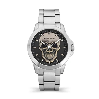 Police Flick Mens Watch with Skull Design Black Dial and Stainless Steel Bracelet, 47mm Case in Branded Box PEWJG2194803 2 Year Warranty