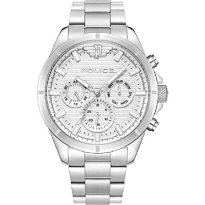 Very beautiful men's watch from Police from the Malawi collection The watch has a silver stainless steel case with a diameter of 45 mm Silver dial, silver hands and indices, mineral glass, calendar, folding clasp, police logo The watch has a water resistance of 5 bar (suitable for everyday use such as B. bathing, showering or washing hands) Equipped with a quartz movement