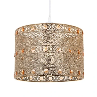 Traditional and Moroccan designed unique easy fit pendant light shade with polished gold plated finish. Features multiple small circular decorative amber acrylic beads which give off an eye-catching crystal glass effect. Total product dimension: Height - 17cm, Width - 24cm, Depth: 24cm. Maximum wattage allowed is 60w. Please note that ceiling rose and cable is not included - pendant shade only. Complete with shade reducer ring allowing for most lamp bases - B22/BC, E14/SES and E27/ES. Light bulb not included., Weight: 1.543235834 pounds, Manufacturer: Happy Homewares