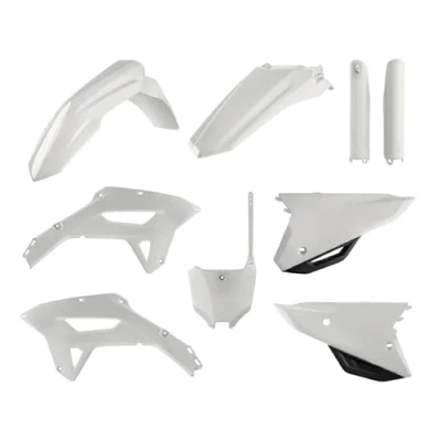 Product: Polisport replicas are made from injected plastic and are equipped with DGP (Durable Gloss Polypropylene), which gives them a high resistance and a beautiful glossy finish. Quality: our kits comply with the standards imposed by regulatory authorities. All parts are inspected in our own quality control centre. Perfect fit and tested, no additional drilling required. IMAGE: More cost-effective alternatives to OEM parts. Enjoy the same quality and technology as the original parts with colour matching and bright, flexible trims. Composition: The kit consists of the following parts, which can also be purchased separately. Front mudguards, rear mudguards, side cover, cooler cover, race number plate and fork guard. Model: Honda CRF250RX 23'-23'/ CRF450RX 21'-23' white