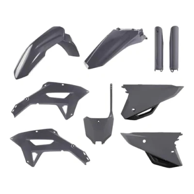 Product: Polisport replicas are made of injected plastic and are equipped with DGP (Durable Gloss Polypropylene) which gives them a high resistance and a beautiful glossy finish. Quality: Our kits comply with the standards applied by the regulatory agencies. All parts are tested in our own quality control centre. Perfect fit and tested, no additional drilling required. IMAGE Lower cost alternatives to OEM parts Enjoy the same quality and technology as the original parts with colour matching and bright, flexible trims. Composition: the kit consists of the following parts, which can also be purchased separately. Front mudguards, rear mudguards, side covers, cooler cover, start number plate and fork guard. Model: Honda CRF450RX 21'-23' N-Grey