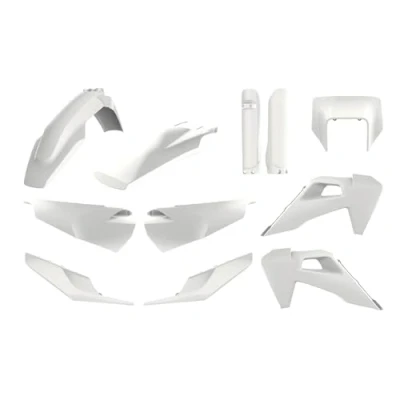 Product: Polisport replicas are made of injected plastic and are equipped with DGP (Durable Gloss Polypropylene) which gives them a high resistance and a beautiful glossy finish. Quality: Our kits comply with the standards applied by the regulatory agencies. All parts are tested in our own quality control centre. Perfect fit and tested, no additional drilling required. IMAGE Lower cost alternatives to OEM parts Enjoy the same quality and technology as the original parts with colour matching and bright, flexible trims. Composition: the kit consists of the following parts, which can also be purchased separately. Front mudguards, rear mudguards, side covers, cooler cover, headlight mask and fork guard. Model: Husqvarna TE/FE 20'-23' white20