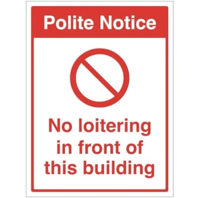 Polite notice: No loitering in front of this building (semi rigid pvc safety sign)