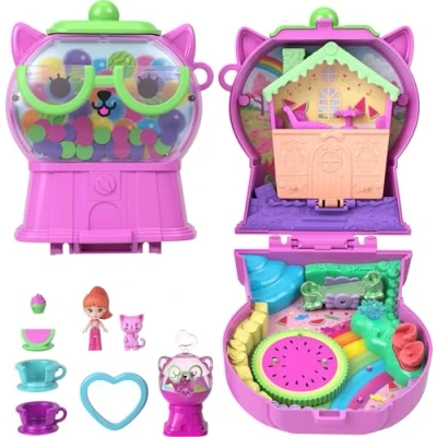 This Polly Pocket Gumball Kitty Compact is poppin'! Imaginations will soar with one micro doll and 8 accessories, including one pet. The adorable gumball machine exterior features a fun glitter shaker! Get ready for ultimate storytelling fun with a watermelon teacup ride, seesaw, and so many “yummy” surprises! Now featuring a keychain clip so you can take the compact anywhere, plus a newly added charm compartment for your doll! Ideal for ages four years old and up, especially those who love candy and kittens., Manufacturer: Mattel
