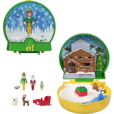 Spread holiday cheer with Buddy the Elf and Polly Pocket in this very merry partnership compact! Shake the Papa Elf snow globe exterior to ring in holiday cheer! Reenact favorite scenes from the movie with three micro dolls, six themed accessories, and iconic interior locations. Make toys with the elves in Santa's workshop or make snow angels with animal friends before taking off in Santa's sleigh. Engage in moving features like a toy that pops up from pressing the stool, a door to the workshop, a present that opens, and a waving narwhal! Ideal for ages 4 years old and up, especially those who love the movie, Elf! Subject to availability., Manufacturer: Mattel