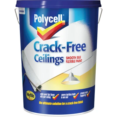 General description Polycell Crack-Free Ceilings is an innovative solution designed to restore cracked ceilings to a smooth, 'as good as new' finish. Its flexible paint formulation utilizes Polyfilla technology to effectively cover cracks while preventing them from reappearing. This product is available in both Matt and Silk finishes. Technical specifications Volume: 5 Litres Coverage: Approximately 6 m²/L Drying time: Surface dry in 2 - 3 hours (depending on conditions)