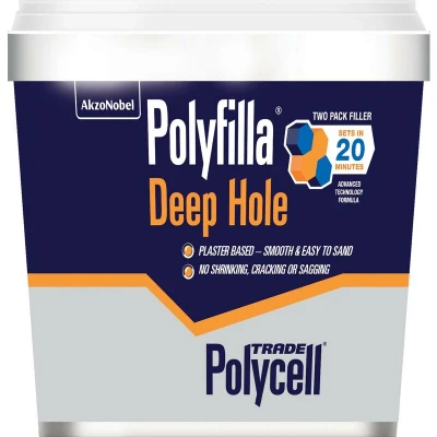 General description Polycell Deep Hole Polyfilla is a two-part plaster-based filler designed to effectively fill deep holes up to 50mm. It dries to a structurally sound repair in just 20 minutes, making it ideal for quick fixes. Technical specifications Filling depth: up to 50mm Drying time: 20 minutes Overpaintable in: 30 minutes Working life: 5-10 minutes Installation Remove inner Part B from the main Part A container. Mix equal amounts of Parts A and B on a flat surface into a smooth, even-colored paste. Press the filler into the repair using a filling knife. Smooth the surface with a wet knife and allow it to set. Sand down when fully dry. Usage Suitable for structural repairs; drillable and accepts screws and nails. No shrinking, cracking, or sagging after application.