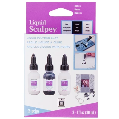 Liquid polymer clay is a versatile product that can be used in Sculpey Tools Silicone Oven-Safe Molds, to embellish clay, used as grout, image transfers, window clings and so much more! So simple to use it is perfect for beginners! This multi-pack allows you to try three colors! Twist cap for precise flow control – open completely to fill mold. Open half way for other detail work. Gently stir before using. Strong and flexible after baking making it perfect for home décor, jewelry, scrapbooking and beyond. To color - mix with alcohol-based inks To thin - add Sculpey Clay Softener until desired consistency is reached. To thicken – pour into a cup and let sit out overnight Add items such as glitter, spices, dried flowers and metal pieces to add interest to your creations before baking! Excellent leveling properties which allow it to be baked in sheets and poured into jewelry findings. Trace or draw on a piece of glass to make window clings. Three 1 oz. bottles – Clear, White and Black.
