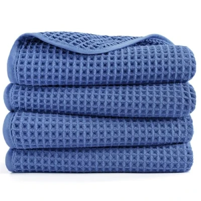 POLYTE Microfibre Lint Free Hand Towel, 40 x 76 cm, 4 Pack (Dark Blue, Waffle Weave)