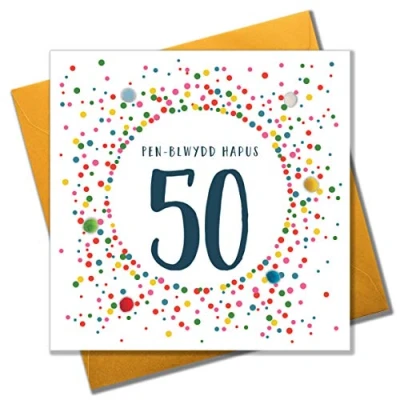 DIMENSIONS: 150x150mm CAPTION: Penblwydd Hapus 50 ENGLISH TRANSLATION: 50th EMBELLISHMENT: Colourful Pompoms BLANK INSIDE: Space inside for your own message MADE IN THE UK: Designed, printed and finished in the UK HIGH-QUALITY: Printed on top quality heavy 350gsm card stock, with envelope included SUSTAINABLE: Comes wrapped in Compostable bag or with a card catch label. Both the greetings card & envelope are sustainably sourced and recyclable STANDARD LETTER SIZE: Can be sent with Royal Mail standard letter stamps