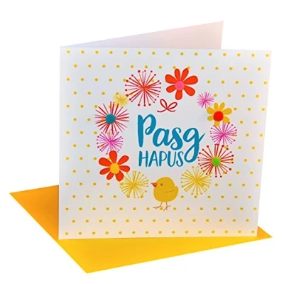 Welsh Language Wording on front - Pasg Hapus Blank inside for your own message Comes cello wrapped with a bright yellow envelope Part of the Pom Pom Easter range. Printed and hand finished in the U.K with beautiful colourful pompom embellishments.