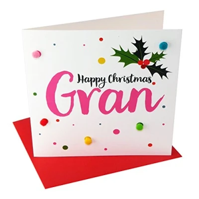 DIMENSIONS: 150x150mm CAPTION: Gran EMBELLISHMENT: Colourful Pompoms BLANK INSIDE: Space inside for your own message MADE IN THE UK: Designed, printed and finished in the UK HIGH-QUALITY: Printed on top quality heavy 350gsm card stock, with envelope included SUSTAINABLE: Comes wrapped in Compostable bag or with a card catch label. Both the greetings card & envelope are sustainably sourced and recyclable STANDARD LETTER SIZE: Can be sent with Royal Mail standard letter stamps