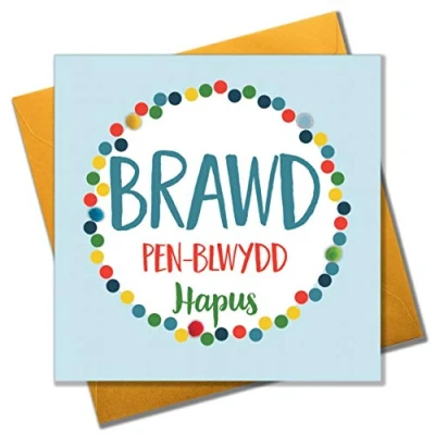 DIMENSIONS: 150x150mm CAPTION: Brawd Penblwydd Hapus ENGLISH TRANSLATION: Happy Birthday, Brother EMBELLISHMENT: Colourful Pompoms BLANK INSIDE: Space inside for your own message MADE IN THE UK: Designed, printed and finished in the UK HIGH-QUALITY: Printed on top quality heavy 350gsm card stock, with envelope included SUSTAINABLE: Comes wrapped in Compostable bag or with a card catch label. Both the greetings card & envelope are sustainably sourced and recyclable STANDARD LETTER SIZE: Can be sent with Royal Mail standard letter stamps Welsh Language Wording on Front - Brawd Pen-blwydd Hapus Blank inside for your own message Comes cello wrapped with a shiny gold envelope Part of the Pom Pom Everyday range. Printed and hand finished in the U.K with beautiful colourful pompom embellishments.