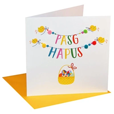 DIMENSIONS: 150x150mm CAPTION: Pasg Hapus ENGLISH TRANSLATION: Happy Easter EMBELLISHMENT: Colourful Pompoms BLANK INSIDE: Space inside for your own message MADE IN THE UK: Designed, printed and finished in the UK HIGH-QUALITY: Printed on top quality heavy 350gsm card stock, with envelope included SUSTAINABLE: Comes wrapped in Compostable bag or with a card catch label. Both the greetings card & envelope are sustainably sourced and recyclable STANDARD LETTER SIZE: Can be sent with Royal Mail standard letter stamps