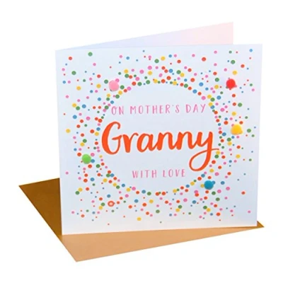 DIMENSIONS: 150x150mm CAPTION: Granny EMBELLISHMENT: Colourful Pompoms BLANK INSIDE: Space inside for your own message MADE IN THE UK: Designed, printed and finished in the UK HIGH-QUALITY: Printed on top quality heavy 350gsm card stock, with envelope included SUSTAINABLE: Comes wrapped in Compostable bag or with a card catch label. Both the greetings card & envelope are sustainably sourced and recyclable STANDARD LETTER SIZE: Can be sent with Royal Mail standard letter stamps