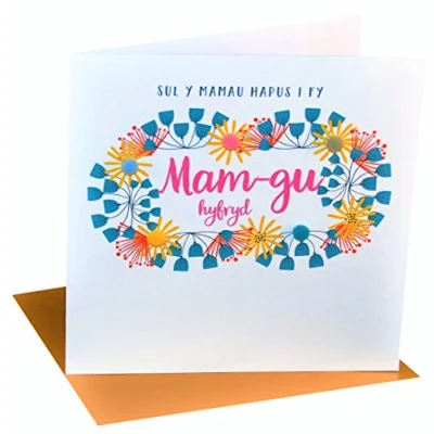 DIMENSIONS: 150x150mm CAPTION: Sul y Mamau Hapus i fy, Mam-gu hyfryd ENGLISH TRANSLATION: Happy Mother's Day to my lovely Grandma EMBELLISHMENT: Colourful Pompoms BLANK INSIDE: Space inside for your own message MADE IN THE UK: Designed, printed and finished in the UK HIGH-QUALITY: Printed on top quality heavy 350gsm card stock, with envelope included SUSTAINABLE: Comes wrapped in Compostable bag or with a card catch label. Both the greetings card & envelope are sustainably sourced and recyclable STANDARD LETTER SIZE: Can be sent with Royal Mail standard letter stamps