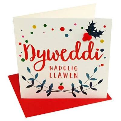 DIMENSIONS: 150x150mm CAPTION: Dyweddi Nadolig Llawen ENGLISH TRANSLATION: Fiancee Merry Christmas EMBELLISHMENT: Colourful Pompoms BLANK INSIDE: Space inside for your own message MADE IN THE UK: Designed, printed and finished in the UK HIGH-QUALITY: Printed on top quality heavy 350gsm card stock, with envelope included SUSTAINABLE: Comes wrapped in Compostable bag or with a card catch label. Both the greetings card & envelope are sustainably sourced and recyclable STANDARD LETTER SIZE: Can be sent with Royal Mail standard letter stamps