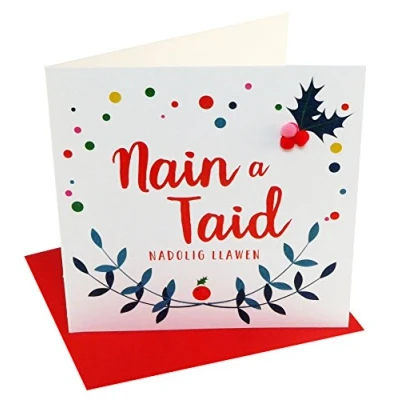 DIMENSIONS: 150x150mm CAPTION: Nain a Taid, Nadolig Llawen ENGLISH TRANSLATION: Granny and Grandad Merry Christmas EMBELLISHMENT: Colourful Pompoms BLANK INSIDE: Space inside for your own message MADE IN THE UK: Designed, printed and finished in the UK HIGH-QUALITY: Printed on top quality heavy 350gsm card stock, with envelope included SUSTAINABLE: Comes wrapped in Compostable bag or with a card catch label. Both the greetings card & envelope are sustainably sourced and recyclable STANDARD LETTER SIZE: Can be sent with Royal Mail standard letter stamps