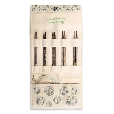 Circular Knitting Needle Set: The Pony Perfect Circular Knitting Needle Set is made from sustainably sourced wood, offering a natural eco-conscious alternative to traditional needles Durable and Smooth Knitting Needles: Featuring 3 types of durable, natural wood needle tips and a kink-resistant plastic cable; This set ensures smooth and uninterrupted stitch flow Patented Glydon Joint: The innovative Glydon joint connects needles seamlessly to the cable, enhancing durability and creating a smooth knitting experience Versatile and Functional Accessories: Includes needle end stoppers to convert circular needles into straight ones and a cable connector for extended knitting length, providing added flexibility Organised and Stylish Storage: The set arrives in a handcrafted cotton canvas case with a soft art nouveau design; featuring jasmine-white felt lining and multiple pockets for organised storage of needles and accessories