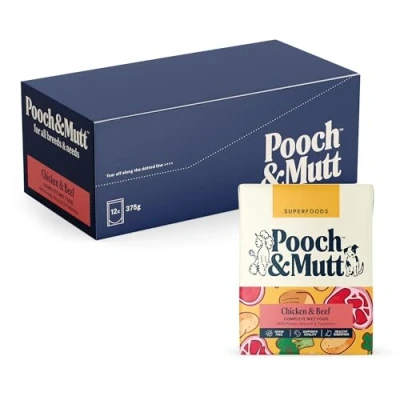 Pooch & Mutt Chicken Beef Pack of Complete Wet Dog Food, Dry Food Topper, 12x375g