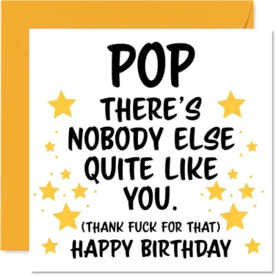 MAKE YOUR POP SMILE WITH THIS UNIQUE BIRTHDAY CARD: This exceptional quality Pop birthday card shows the design 'Pop Theres nobody else quite like you. (Thank fuck for that) Happy Birthday'. If you are looking for an awesome birthday card for Pop, then then this happy birthday Pop card is bound to make them smile. Not just a birthday card for Pop this could also be a birthday gifts for Pop, Dad or Daddy. WHAT DO YOU GET: The card is printed on one side and BLANK ON THE INSIDE to allow you to write your very own message. The unique fun design is printed on a specially sourced and environmentally responsible board. At 360 microns thick the natural white one-sided gloss board has a quality look and feel. Supplied with a coloured gummed envelope to complement the design and ready to be sealed and sent in the post. Great Pop birthday cards, Dad birthday card. NO INK SMUDGES: There is nothing worse than writing inside a card to find that the shiny surface makes the ink smudge. This is why we use a high quality one sided coated board. The uncoated side will absorb more of the ink from your pen to make smudging a thing of the past. Pop birthday cards, Pop birthday cards from Son. SIZES: Greeting Card = 145mm x 145mm, Envelope = 155mm x 155mm, Card Thickness = 360 micron. Happy birthday Pop, Pops birthday card, Pop cards birthday, birthday card Pop, happy birthday Pop card, Pop gifts from Son. MADE AND QUALITY CHECKED IN THE UK: We print and manufacture all our products right here in the UK so you can be sure of a fast turnaround and a product that is expertly made. Using environmentally responsible premium board our card is conscious of the responsible management of the world's forests - happy birthday card Pop, Pop birthday cards.