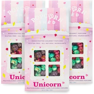 Popcorn Shed 3 x Unicorn Gourmet Popcorn, Gift Box, Multicoloured Candy Floss Caramel Natural and Gluten Free Movie Night Snack, 80 g