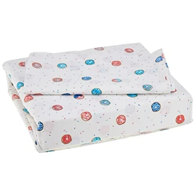 FIBER TYPE: Product made of 100% Cotton fibers, this material is constructed to be breathable and comfortable STYLE & COLOR: This sheet set has a crisp and cool feel. Durable construction perfect for every day use.. The Poppy & Fritz Polka Donuts pattern features a graphic blue, pink, and multi-tonal donuts and sprinkles on a white ground. Available in alternate sizes. FIT DETAILS: Fitted sheet fully elastic- Premium elastic installed all-around to keep the fitted sheet in place; 12" fitted sheet pocket depth. The Poppy & Fritz Polka Donuts pattern features a graphic blue, pink, and multi-tonal donuts and sprinkles on a white ground. Available in alternate sizes. INCLUDED: Twin Fitted Sheet (1-Piece): 75"W X 39"L, Twin Flat Sheet (1-Piece): 96"W X 66"L, Standard Pillowcase (1-Piece): 30"W X 20"L FEATURES & CARE: Easy Care- Machine washable
