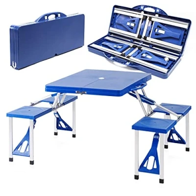 This portable picnic table offers four seats The seats are connected to the table top and function as table legs Easy to transport as it can be folded to a size of 85 x 10 x 39.5 cm If folded the table turns into a handy case that barely takes up storage space Being made of plastic and aluminium the table is weatherproof and easy to clean