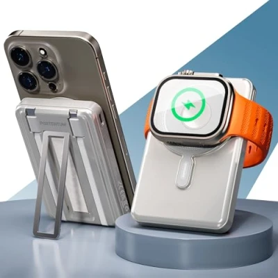 5-IN-1 VERSATILITY – ALL-IN-ONE – The PORTENTUM MagSafe power bank fast charging combines magnetic Qi charging, USB-C PD 20W port, Lightning cable, USB-C cable and an Apple Watch module. Five charging options in one ultracompact device with foldable stand to use your phone vertically or horizontally while charging. Ideal for travel, office or everyday use. INTEGRATED LIGHTNING AND USB-C CABLES – Forget separate accessories: this portable charger includes two built-in connectors (USB-C and Lightning) stored inside the case. Charge iPhone, iPad or any Android device directly, while combining with Qi or the USB-C PD port to power multiple devices at once. APPLE WATCH CHARGER COMPATIBLE – Features a dedicated module for your smartwatch, acting as an apple watch charger compatible with the official output to keep your device always ready. The PORTENTUM battery pack allows you to charge iPhone and Apple Watch simultaneously, providing total convenience on the go. FAST CHARGING 20W PD/QC + QI 15W – Enjoy optimal speed with the USB-C PD 20W output and magnetic Qi wireless charging up to 15W. This power bank fast charging recovers up to 60% battery in about 30 minutes depending on the smartphone model, ensuring instant autonomy anytime. 10000 mAh IN A COMPACT DESIGN – With a 10000 mAh capacity, this battery pack provides 2–3 full charges for a standard smartphone. Equipped with LED indicators and an 18W USB-C input, it recharges in just over 2 hours. The power bank combines power and practicality with integrated safety systems for reliable charging in every situation.