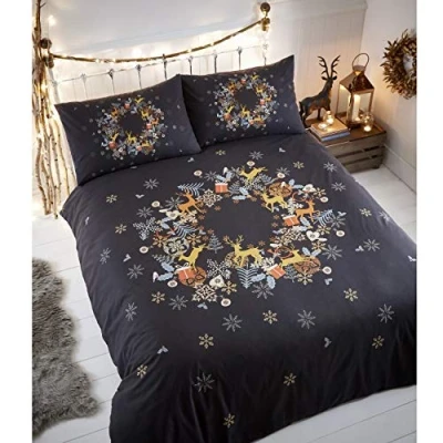 Stylish Christmas wreath design shaped from various decorations in a neat modern style Contents: 1 x double duvet cover (200 x 200 cm) and 2 pillowcases (50 x 75 cm) Materials: 52% Cotton, 48% Polyester Machine washable, can be tumble dried