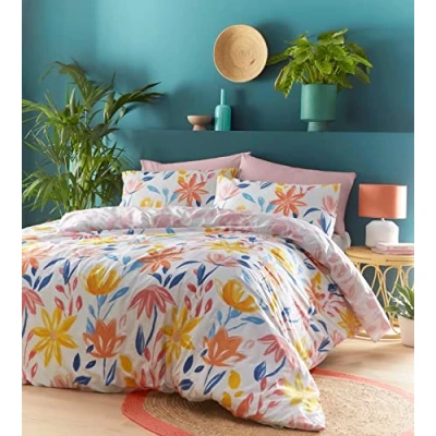 Add a touch of summer to your bedroom in preparation for the coming months with these beautiful floral themed duvet cover set. Escape into the vibrant bunches of summer florals, with statement bright watercolour flowers, be divinely guided into this warm summery duvet. A pastel pink version is contrast on the reverse. Material - Polycotton (52% Polyester/48% Cotton). Care instructions - Machine Washable, Can be tubmle dried. Contents - Super king size duvet cover (220x260cm) plus 2 matching pillowcases (50x75cm)