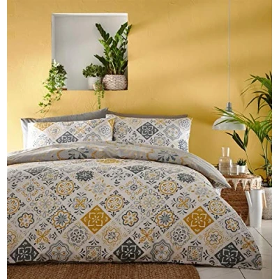 Add a touch of both style and comfort to your bedroom with this beautifully designed duvet cover set. Featuring an array of unique ethnic floral patterns printed into a tile like pattern in an ochre colourway bordered by a crisp white backdrop one on side, with the reverse featuring a more simplistic floral themed design. Contents - 1 x Double duvet cover (200x200cm) plus 2 x matching pillowcase (50x75cm) Material - Polycotton (52% Polyester 48% Cotton) Care Instructions - Machine washable at 40°c , can be tumble dried on a low heat This duvet cover set is also fully reversible meaning you are getting two stunning, unique designs for the price of one