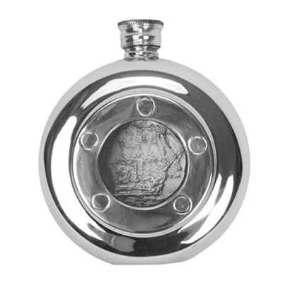 Sheffield pewter flask with clear porthole Fits easily in jacket pocket Capacity 140ml From Nauticalia, specialists in nautical gifts and accessories since 1974