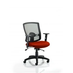 High density soft moulded bespoke fabric seat. Contoured mesh backrest. Two lever infinite lock mechanism. Backrest angle adjustment. Weight tilt tension control. Height adjustable lumbar support. Height adjustable padded arms. Removable arms.