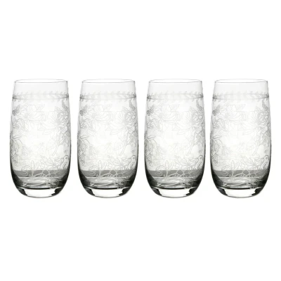 This Portmeirion Botanic Garden Set of 4 Hi Ball Glasses are delicately etched and are perfect for serving cool summer drinks or for celebrations.The classic etched glasses can be used for special occasions or enjoyed for everyday use.Perfect for giving as a gift for family and friends.Size: 16(H) x 7(W) x 7(D)cm.Botanic Garden features the iconic laurel leaf border with a range of beautiful flowers. Inroduced in 1972, even after 50 years this distinctive range is still being bought, used and loved by customers all over the globe.