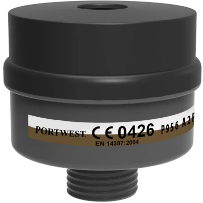Meet the Portwest A2P3 Combination Filter with Universal Thread - Black, designed to offer superior protection in environments exposed to harmful substances, solvents, toxic particles, and microorganisms. It is your shield against the invisible threats, offering a dual class 2 and class 3 filtration system for gases and particles, respectively. When paired with full-face masks featuring the standard DIN threaded connection, it assures a secure and robust protective barrier for the wearer.Key Features: Standard DIN Threaded Connection: Equipped with a universal thread connection as per the EN 148-1 standard, ensuring compatibility with all full-face masks furnished with the same type of connection, providing a secure and airtight fit. Individually Packed: The individual packing makes it suitable for vending machines, adding to the convenience of procurement and maintenance of the safety inventory. Retail Box: Comes in a retail box which not only aids in presentation for retail sales but also ensures the product remains undamaged until ready for use. Lightweight and Comfortable: Designed to be lightweight yet sturdy, allowing for comfortable usage over extended periods without compromising on the protection offered.Certification and Compliance: CE Certified: Bearing the CE certification, this filter meets the essential requirements of health and safety stipulated by the EU guidelines. Compliance with Standards: It complies with the ITALCERT SRL standards, adhering to both EN 148-1 for universal thread connection and EN 14387 Type A Class 2 and Type P Class 3 standards, ensuring high-level protection against a variety of hazardous substances.Opt for the Portwest A2P3 Combination Filter with Universal Thread - Black for a protective solution that integrates safety with comfort, promoting a healthy and secure work environment.